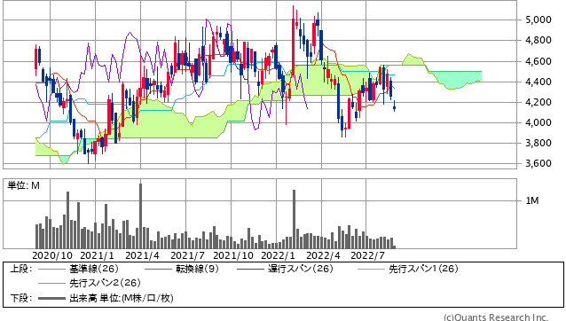 足元の株価は、一目均衡表の週足「雲」に上値を押さえられる格好となっており、当面は同水準を明確に上抜けるかどうかが焦点。週足「雲」を上抜ければ、週足のMACDがプラス圏に浮上することとなり、そこから上値余地が拡がりやすい。さしあたり、2月高値の5,140円が上値の目安になると見られる。