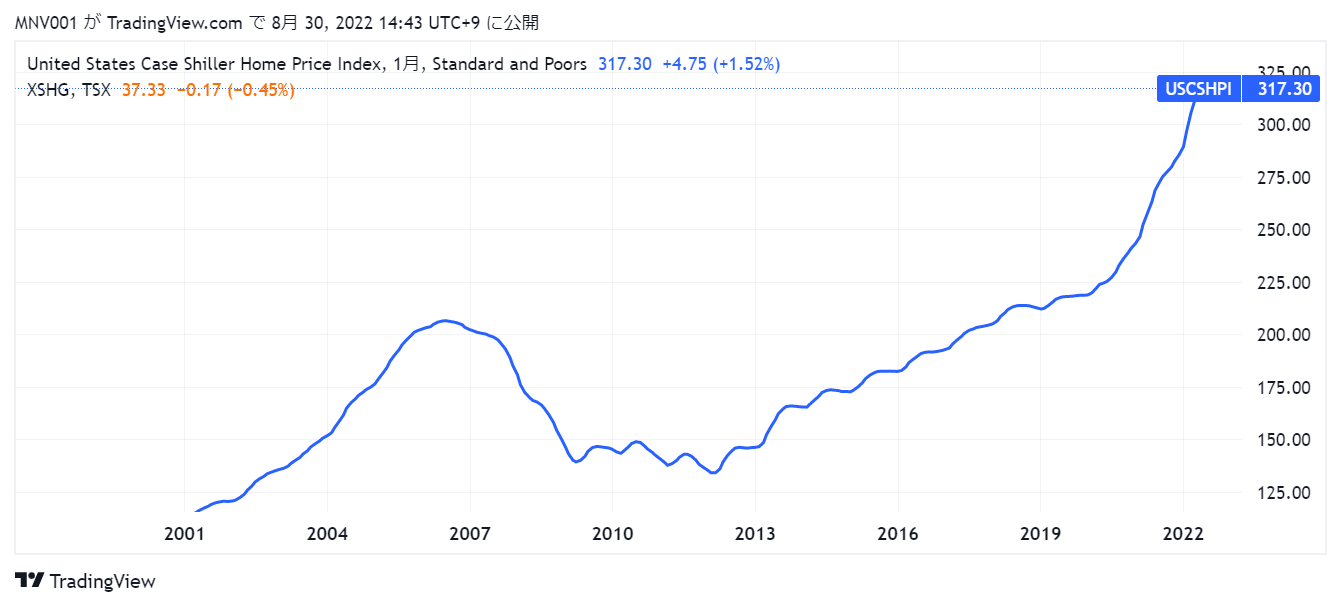 リーマン危機後の金融緩和で、米国株は3倍、不動産価格は、最高だったリーマン危機前の2倍に上がっています。(ケース・シラー指数:2000年~2022年)