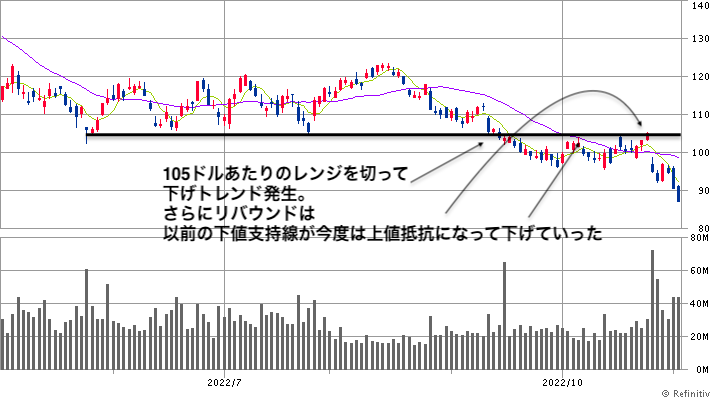 サードパーティクッキー廃止という構造問題と、業態変換(多額の開発費がいる)の過渡期にいるメタはほとんど戻ることなく下げ続けている。特に150ドルのレンジ下限を下はなれてからは下げが加速した結果になった。