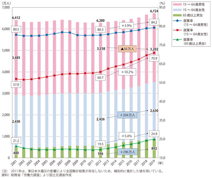 就業者数と就業率の推移(出典:国土交通白書2020)
