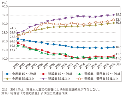 これらの高齢層はどこの業種で増えているのだろうか。『国土交通白書2020』にはこのような文章がある。
