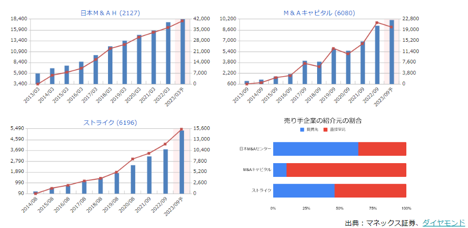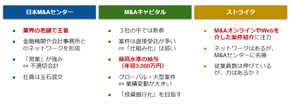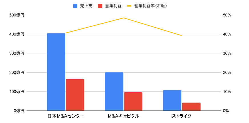 規模感としては日本M&Aセンターが最も大きく、M&Aキャピタルがその約半分、ストライクがさらにその半分といったところです。