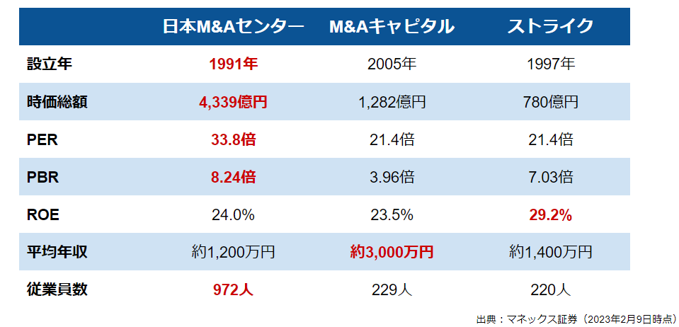 東証プライムに上場しているのが、日本M&Aセンター、M&Aキャピタル、ストライクの3社となりますが、この3社を比べてみましょう。