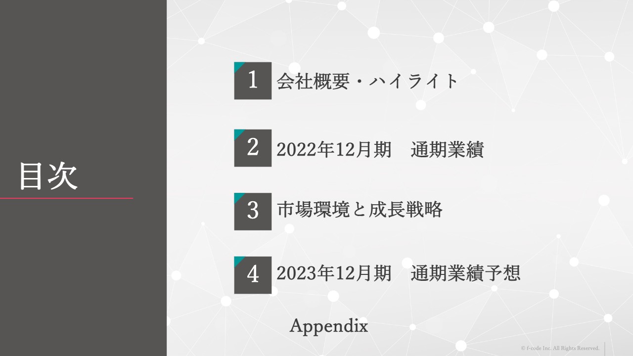 工藤勉氏(以下、工藤):株式会社エフ・コード代表の工藤と申します。本日は、会社概要をご説明したあと、2022年12月期の通期業績、今後の成長戦略、2023年度の業績予想についてご説明します。よろしくお願いします。