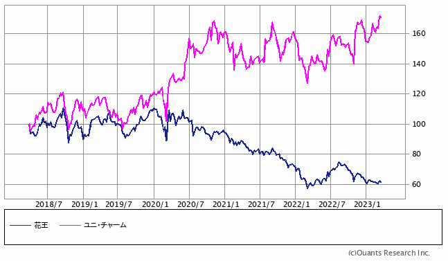 株価を見ても、ユニ・チャームは伸ばしてきていて、花王との明暗がくっきりと分かれている状況です。