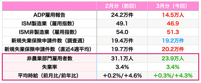 先に発表された雇用関連の経済指標は、全体的に悪化傾向ですから、あまり強気になれる状況ではありません。一方で、予想は非農業部門雇用者数が+23.9万人増、平均時給が前月比+0.3%・前年比+4.3%とまずまず堅調な数字が並んでいます。