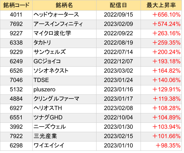 ※当情報は株エヴァンジェリストの『本日の無料特選銘柄』から2022年7月〜2023年6月に配信されたものをピックアップしてご紹介しています。『本日の無料特選銘柄』には上昇したものだけではなく、紹介後、予想に反した推移となった銘柄もございます(※2023年6月15日引け時点のデータです)。