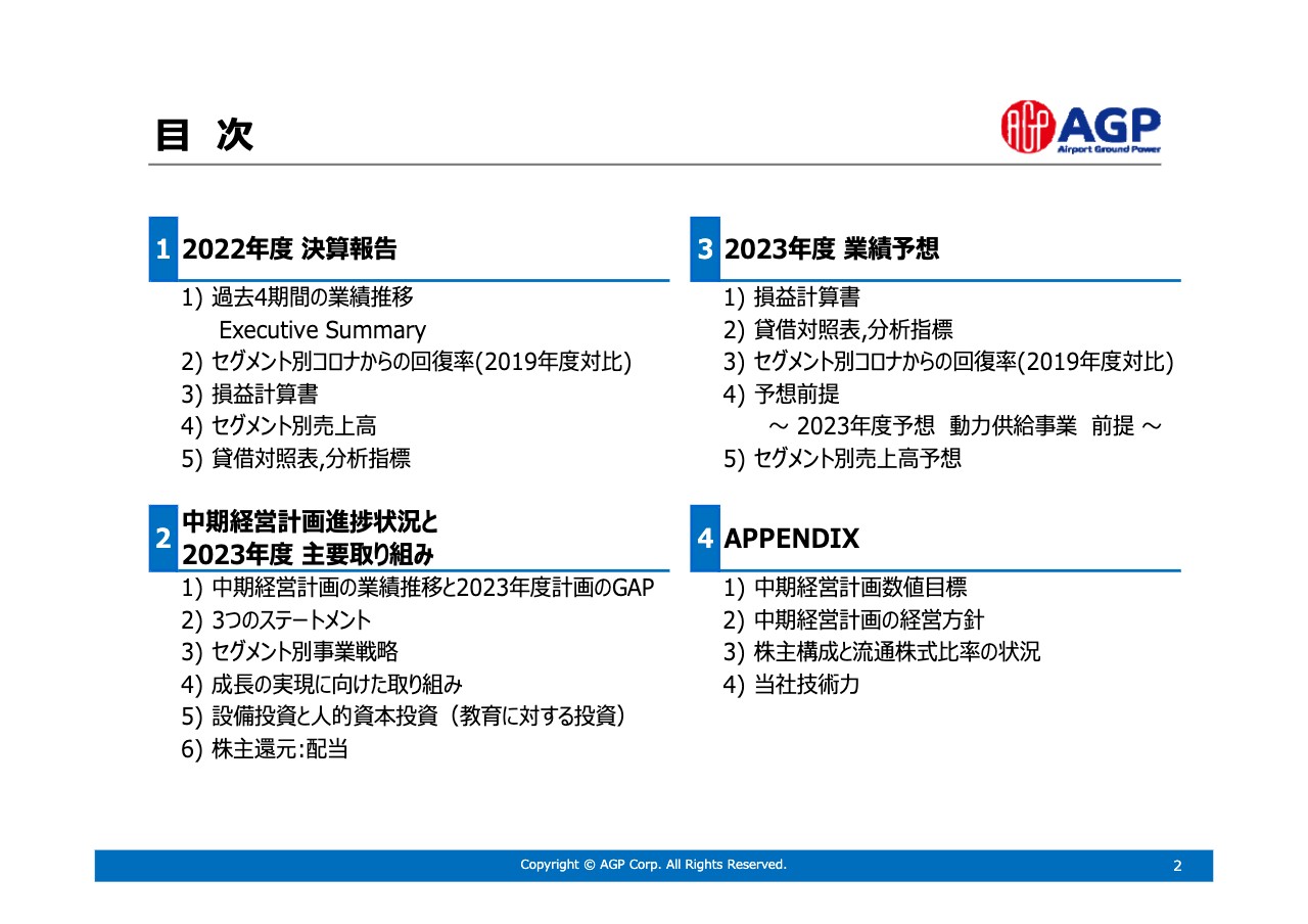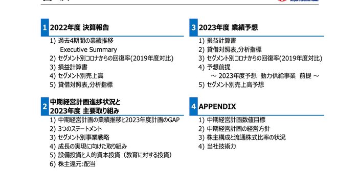 こちらが本日の目次です。2022年度の決算報告、中期経営計画の進捗状況と2023年度の主要取り組みについてご説明した後に、2023年度の業績予想についてお話しします。
