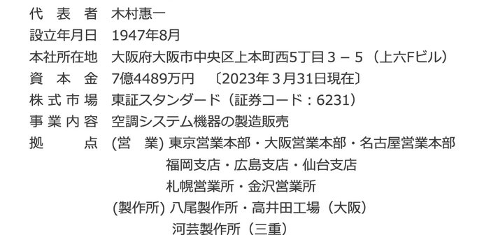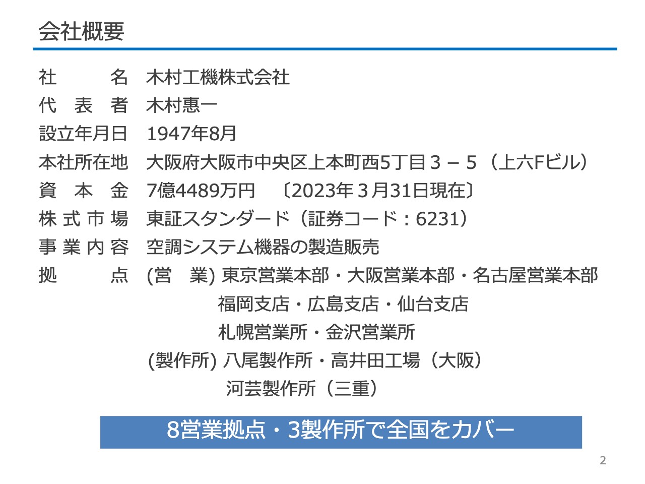 木村惠一氏:まず、会社概要についてご説明させていただきます。当社は1947年に伸銅品の卸売業として設立し、1953年に空調機器の製造販売業を開始してからは業務用空調を中心に事業を展開してきました。本社は大阪市にあり、大阪城の近くに位置しています。8つの営業拠点と3つの製作所で日本全国をカバーしています。