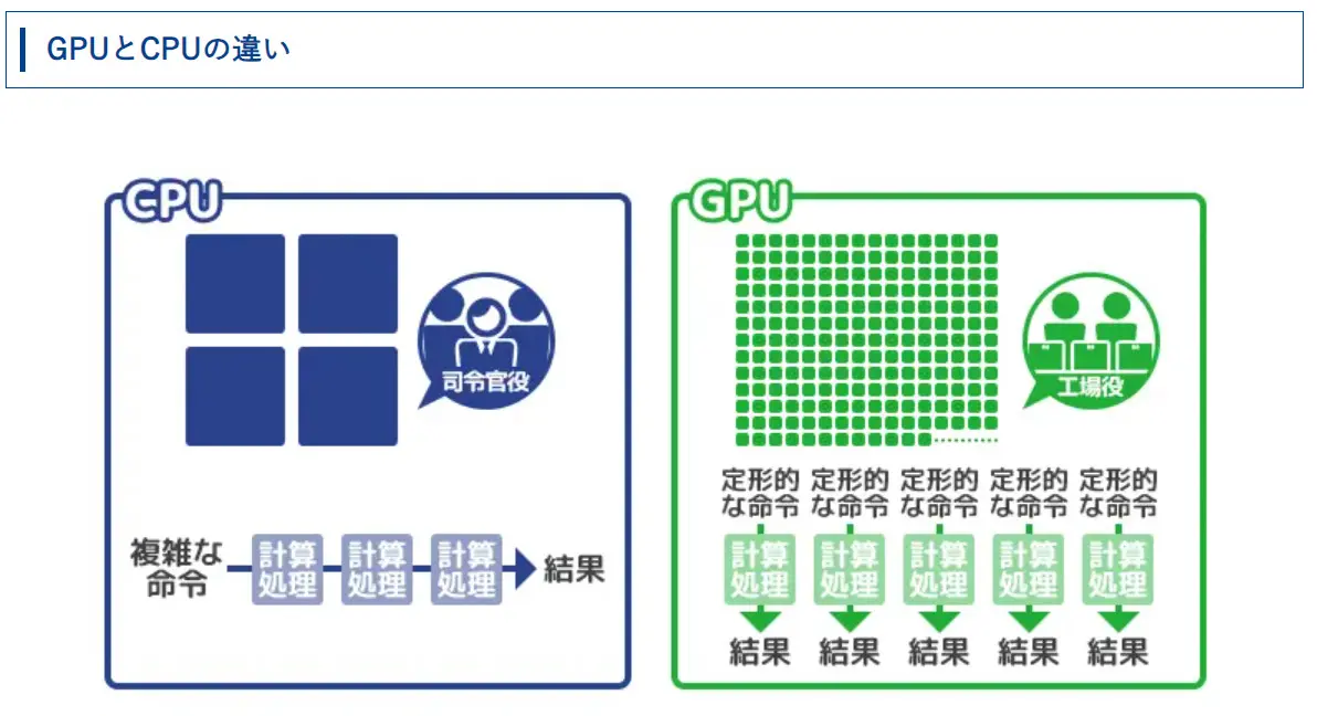 「CPU」は複雑な計算処理を行って1つの答えを導き出すものであるのに対し、「GPU」は同時並行的に大量に処理を行うものです。