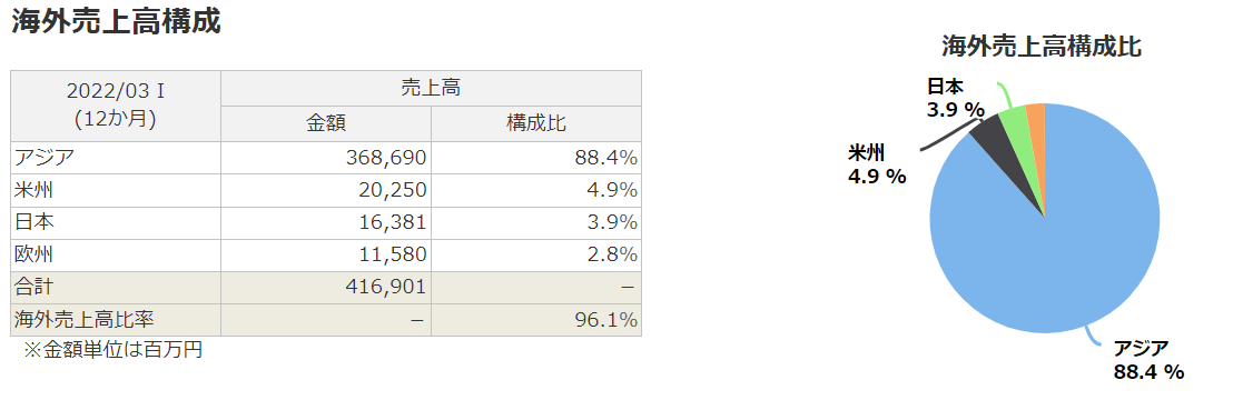 地域別の売上高を見ると、アジアが88.4%、米州が4.9%です。