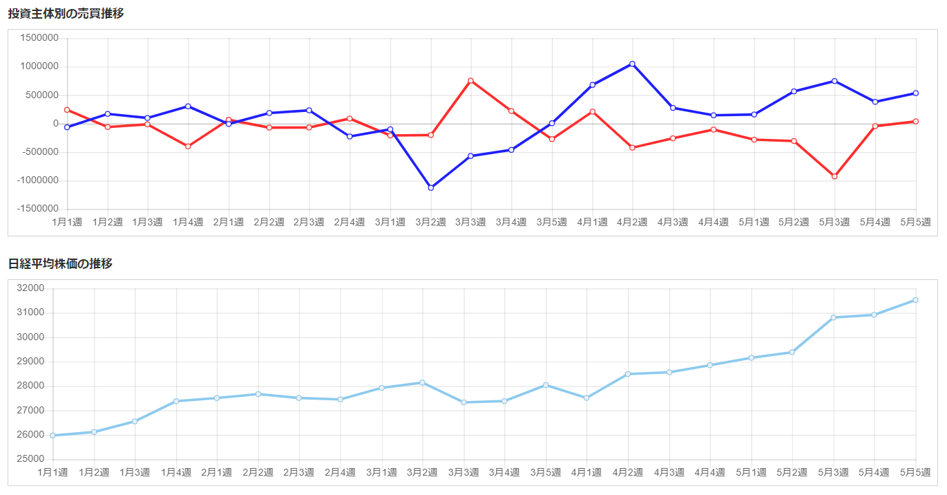これは、投資主体別売買動向と日経平均を並べたグラフですが、海外投資家(青線)が買い越しに転じた時には日経平均が上がりやすいと言われていて、実際に3月からはずっとプラスで推移していて、その間日経平均は上昇し続けています。