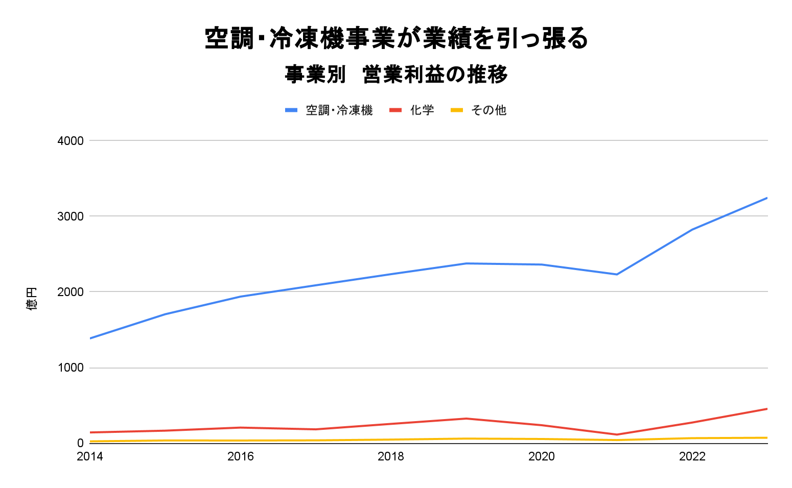 空調・冷凍機事業で住宅・業務用空調や暖房給湯機器を取り扱い、化学事業では半導体や冷房ガスを製造開発しています。営業利益の推移を見ると空調事業が主力であることが分かります。