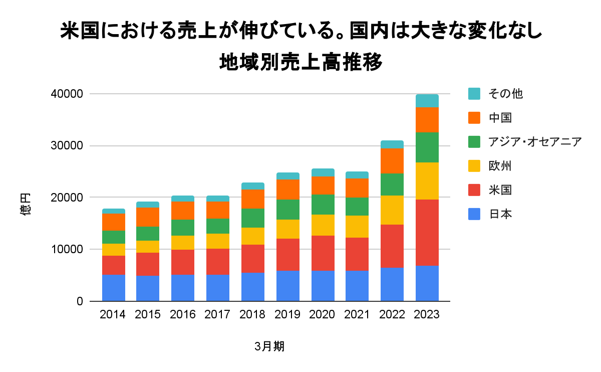 地域別の売上推移を見ると、23年3月期は米国における売上が拡大していることが分かります。