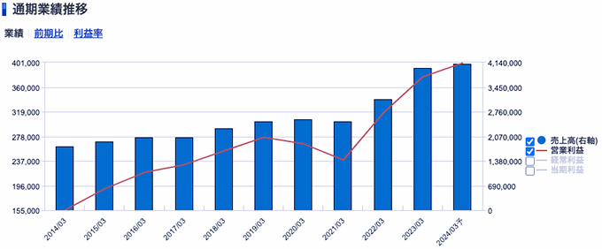 まずは業績を見てみましょう。23年3月期は売上・利益共に過去最高、24年3月期もそれを更新し、連続で過去最高を更新する見込みです。長期的に右肩上がりで成長していることが分かります。
