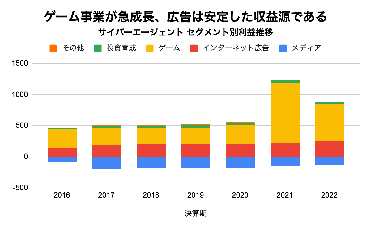 セグメント別の売上推移を見ると、最大の収益源は、インターネット広告事業。次いでゲーム事業であることが分かります。