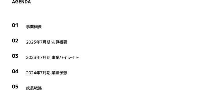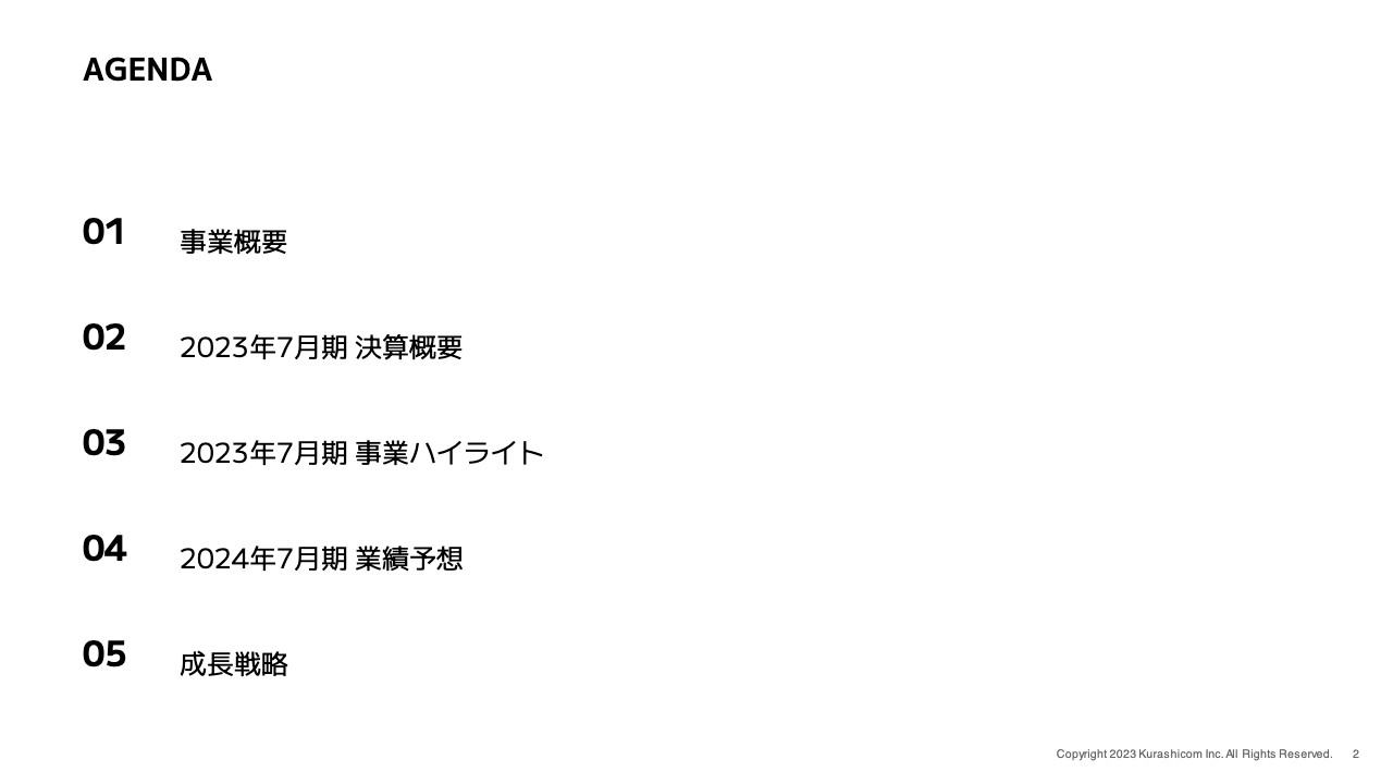 本日のアジェンダです。事業概要、2023年7月期決算概要、2023年7月期事業ハイライト、2024年7月期業績予想、成長戦略について順次ご説明します。