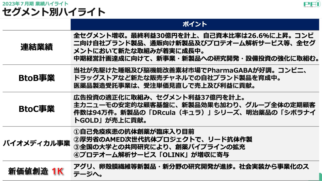 益田和二行氏:まずは決算説明から始めさせていただきます。2023年7月期の業績ハイライトです。2023年7月期は全セグメントにおいて増収を達成することができました。最終利益は30億円を計上し、自己資本比率も26.6パーセントに上昇しました。