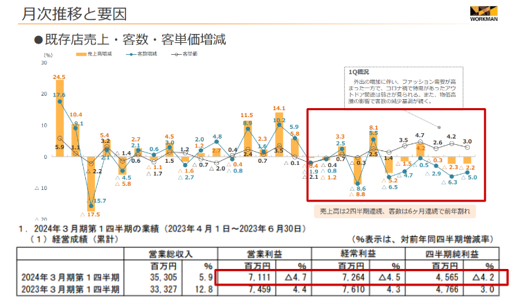 ワークマンは既存店舗数を増やしているため、売上自体は増加していますが、既存店売上高が前年を下回る傾向が見られます。
