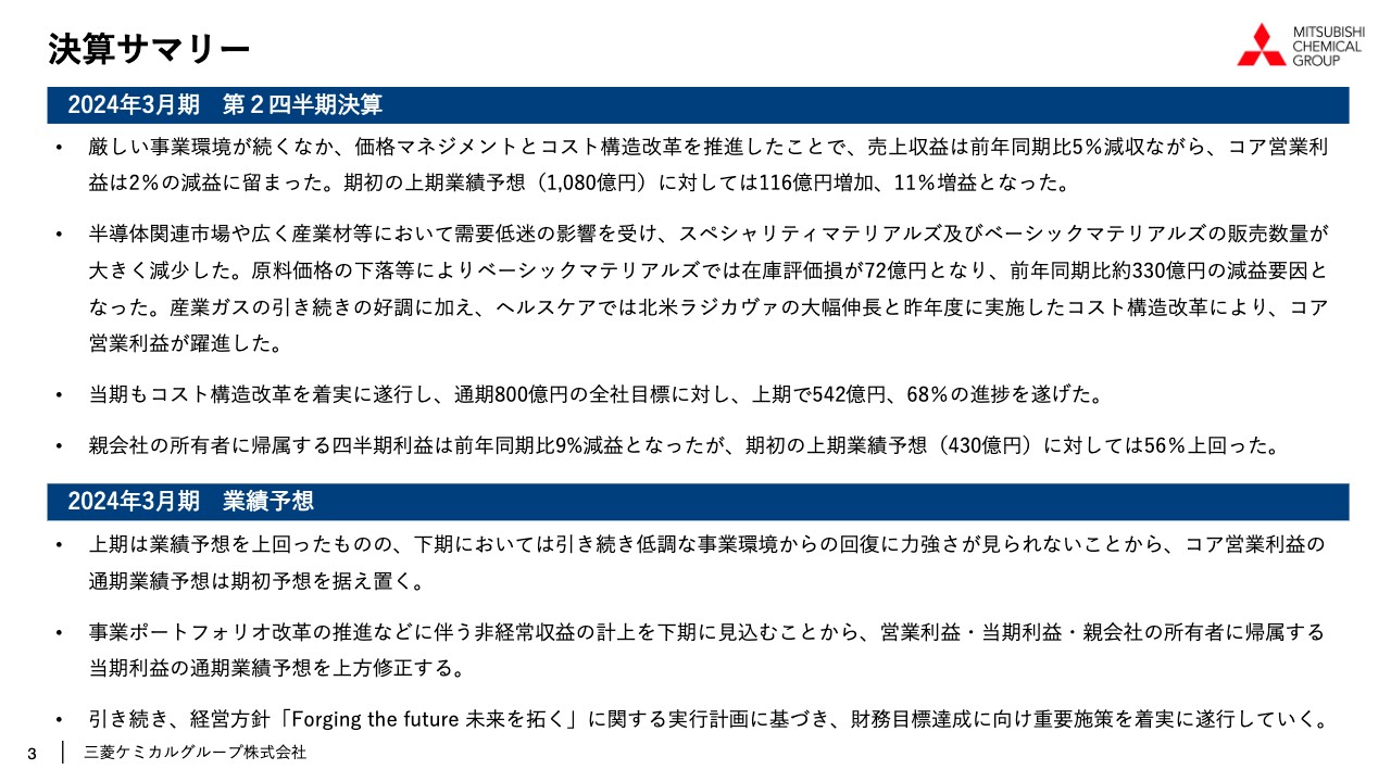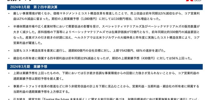 2023年11月1日に発表された、三菱ケミカルグループ株式会社2024年3月期第2四半期決算説明の内容を書き起こしでお伝えします。