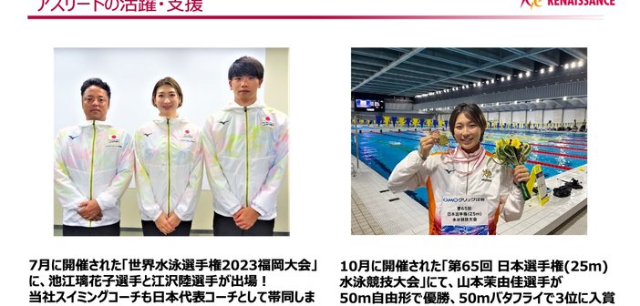 説明に先立ち、7月に開催された「世界戦水泳選手権2023福岡大会」において、池江璃花子選手と当社所属の江沢陸選手が日本代表選手として出場しました。また、当社スイミングコーチが日本代表コーチとして帯同したことをご報告します。