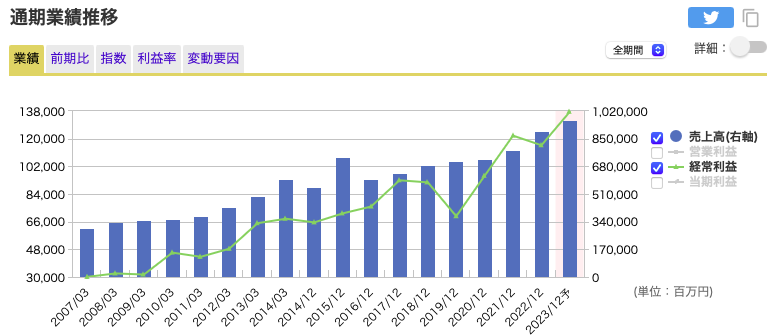 業績は綺麗な右肩上がりで成長しています。それに伴い、株価は10年で約3倍に上昇しています。