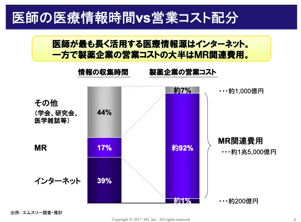 さらに、製薬会社の営業コストで最も重いのがMR関連費用であり、1兆円ものコストを費やします。したがって製薬会社にとっては、MR君の年間1.5億円の使用料は、相対的に割安なのです。