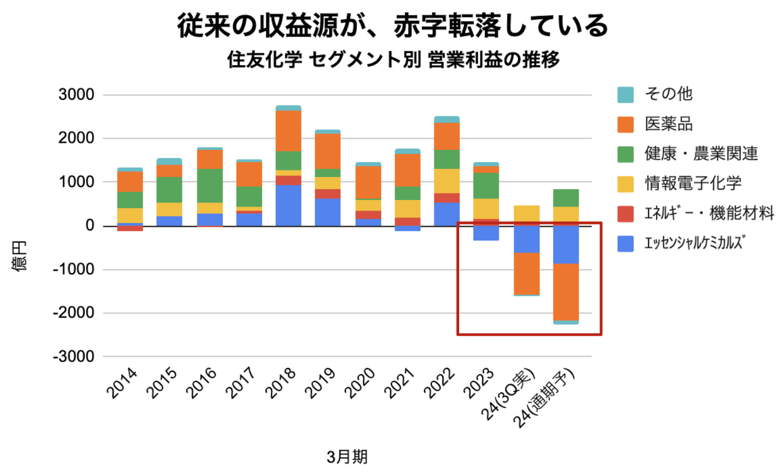 これをセグメントごとの利益推移に分けると、2015年から2022年にかけて好調だった医薬品セグメントや、エッセンシャルケミカルズセグメントが大きく足を引っ張っていることが分かります。そして、この2つが下方修正をもたらした最大の理由です。