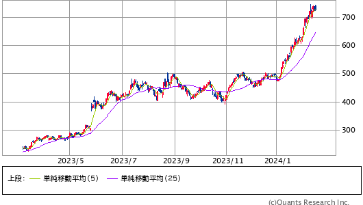 当然、織り込まれての上昇なのだが、実際の結果によって出尽くしになるのか否か……はわからない。現在は726.13ドルで年初からの1か月半で上昇率は50%を超えている。