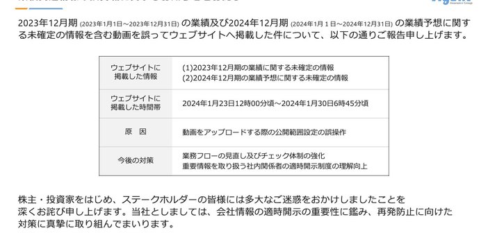 2023年12月期の業績及び2024年12月期の業績予想に関する未確定な情報を含む動画を誤ってWebサイトへ掲載した件について、株主・投資家のみなさまをはじめとするステークホルダーのみなさま方に多大なご迷惑をおかけしましたことを、深くお詫び申し上げます。