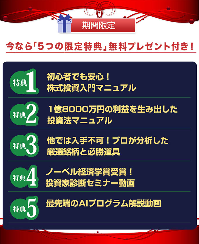 多くの投資家から注目を集める「OMAスクール」の無料オンライン講座を受講すると、今だけ期間限定で株式投資入門マニュアルやプロの厳選銘柄など、5つの限定特典がもらえます。