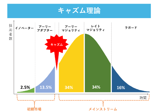 新しい製品や市場が現れた時に、いち早く飛びつくイノベーター・アーリーアダプターといった層から、アーリーマジョリティー・レイトマジョリティーという一般層に広がるまでにはかなり時間を要し、途中にキャズム(断絶)があるという「キャズム理論」があります。