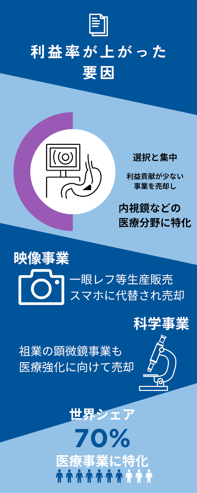 これらの目的は、オリンパスを「グローバルなメディカルのテクノロジー企業(メドテック企業)」へとシフトするため。利益貢献度が低い事業を売却し、そのリソースを医療事業に最大限活用することを目指したのです。