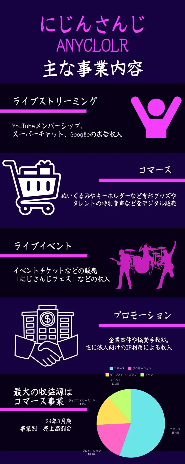 VTuberグループの「にじさんじ」を運営し、YouTubeなどで動画配信を行っています。