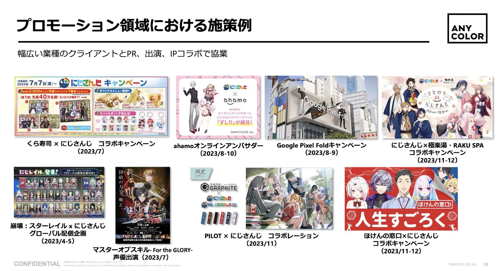 加えて、近年成長しているプロモーション事業の内容は、文房具や携帯電話、寿司チェーン店やスーパー銭湯とのコラボです。基本的には所属VTuberを稼働させる時間が短く、こちらもコストが低く稼げるビジネスと言えるでしょう。