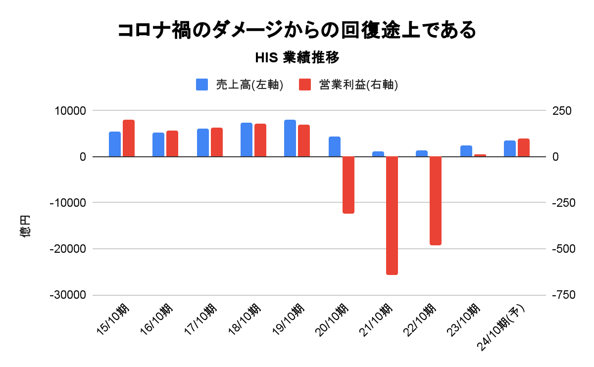 これらをまとめるとHISの事業環境は、「コロナ禍から回復はしているけれども為替の影響などもあり、本来の需要が戻ってきてるわけではない」こういったことが言えるでしょう。