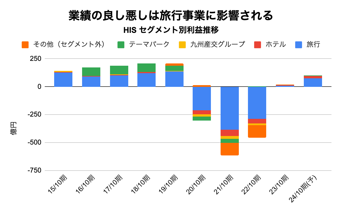 この利益をセグメントごとに分けてみると、ホテル事業やテーマパーク事業などがありますが、やはり主力は旅行事業です。HISは旅行ビジネスによって利益を得るビジネスと言えるでしょう。