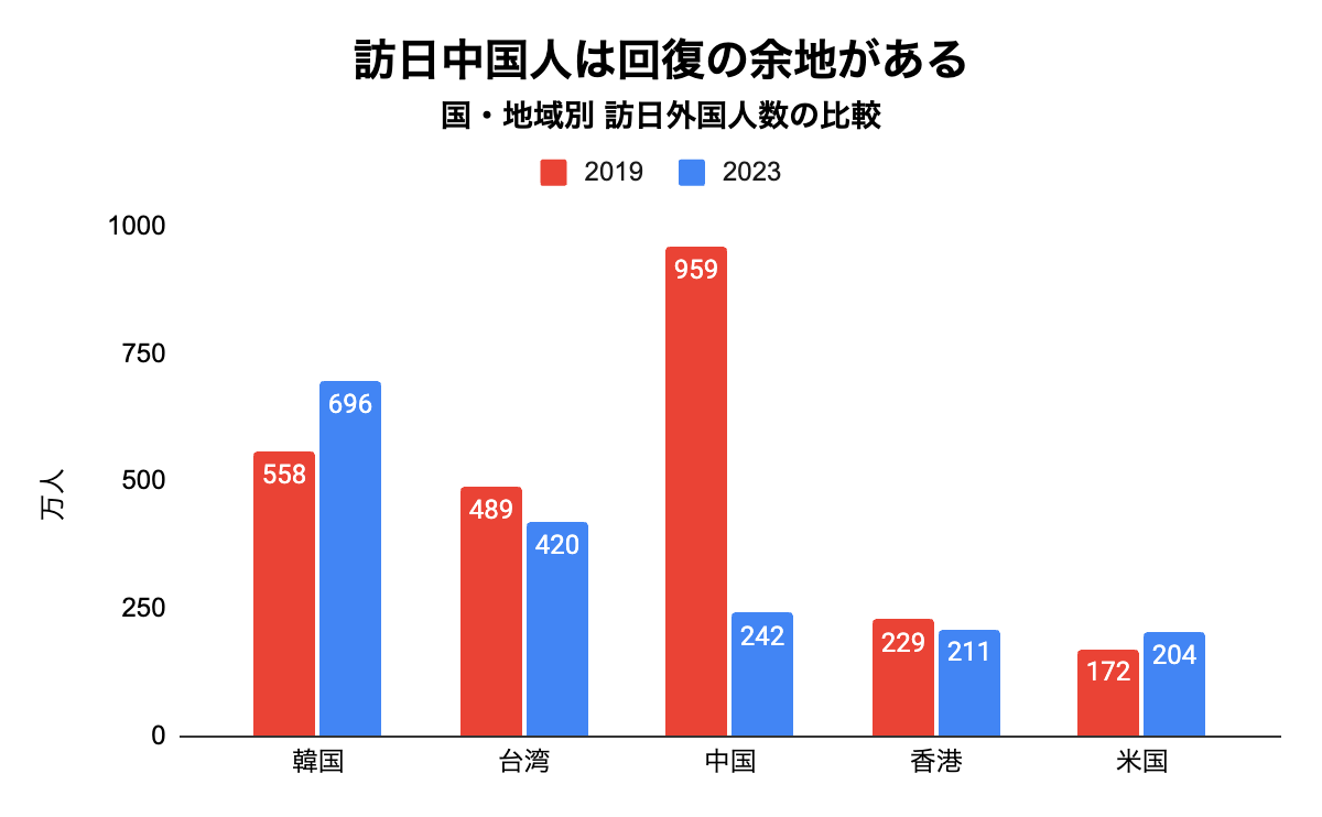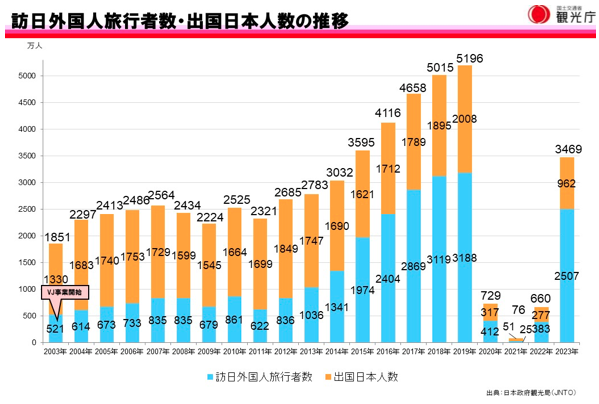 また、市場全体の推移を見ると、出国日本人数は未だコロナ前の半分以下です。