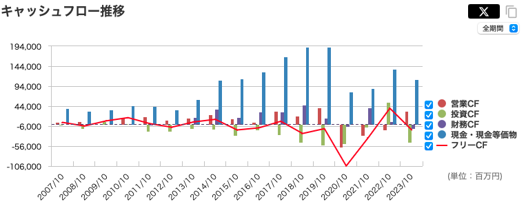 この時には、前述の旅行前受金が旅行キャンセルによって800億円近く流出しています。これに伴い、営業キャッシュフローが一気に悪化しました。