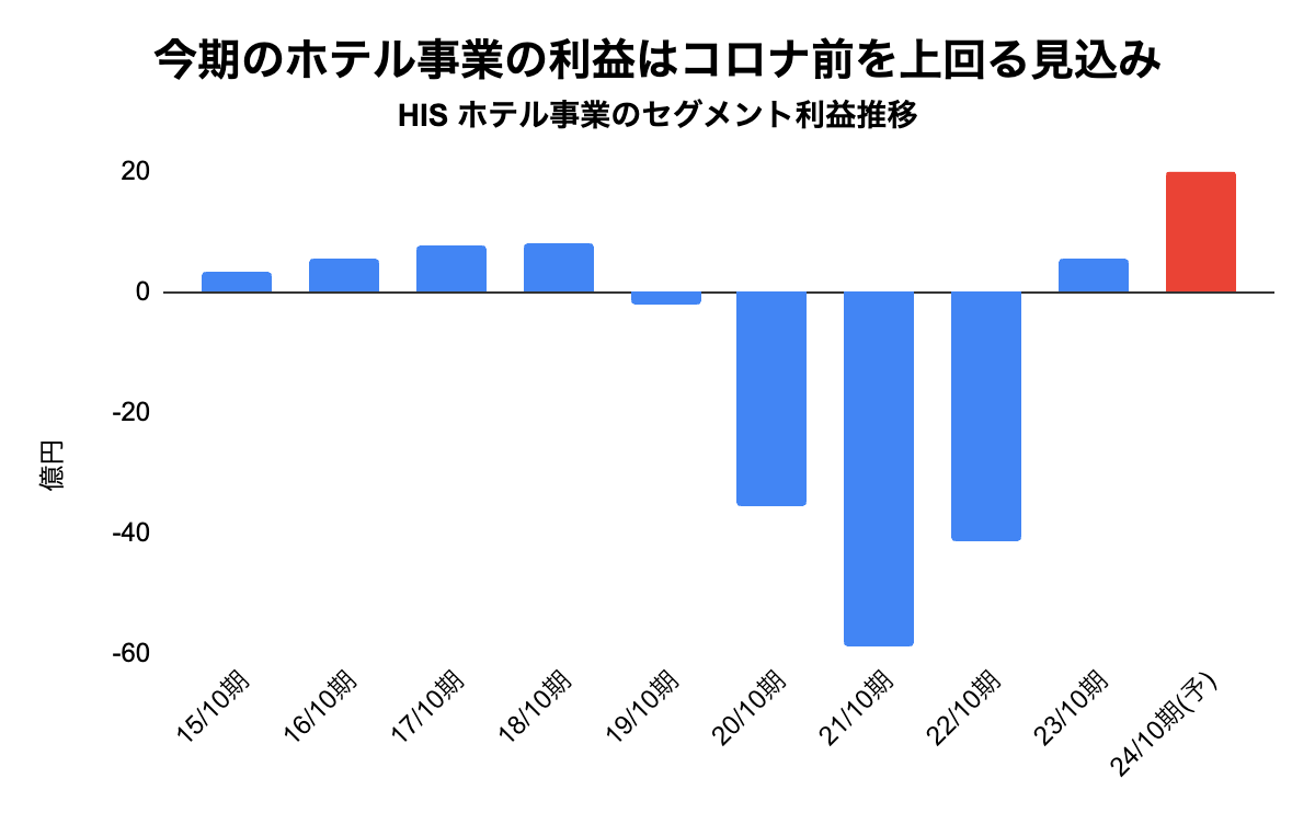 実は、ホテル事業単体で見れば好調です。24年10月期の利益予想は20億円であり、過去最高を達成する見込みです。