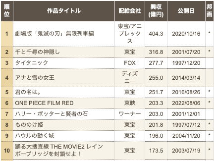 日本の歴代興行収入トップ10のうち、実に6つが東宝が配給した映画なのです。