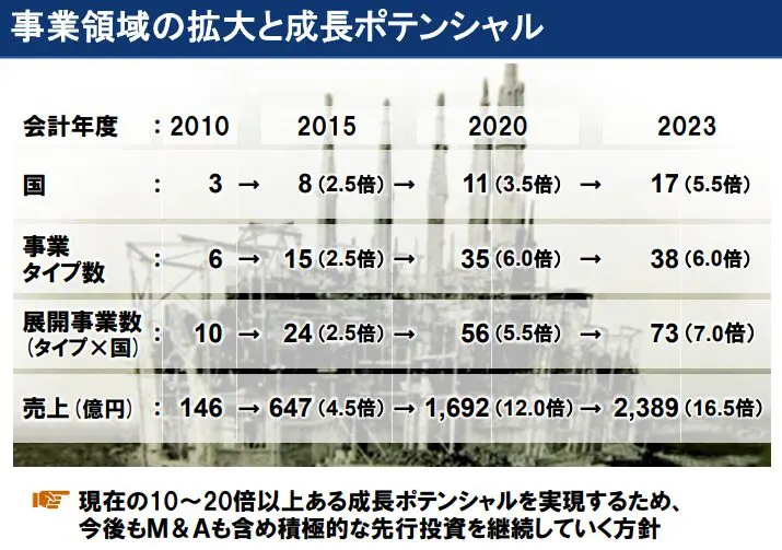それを日本だけでなく世界に拡大することで、【事業タイプ数×国】という形で事業が大きくなる戦略を描いています。