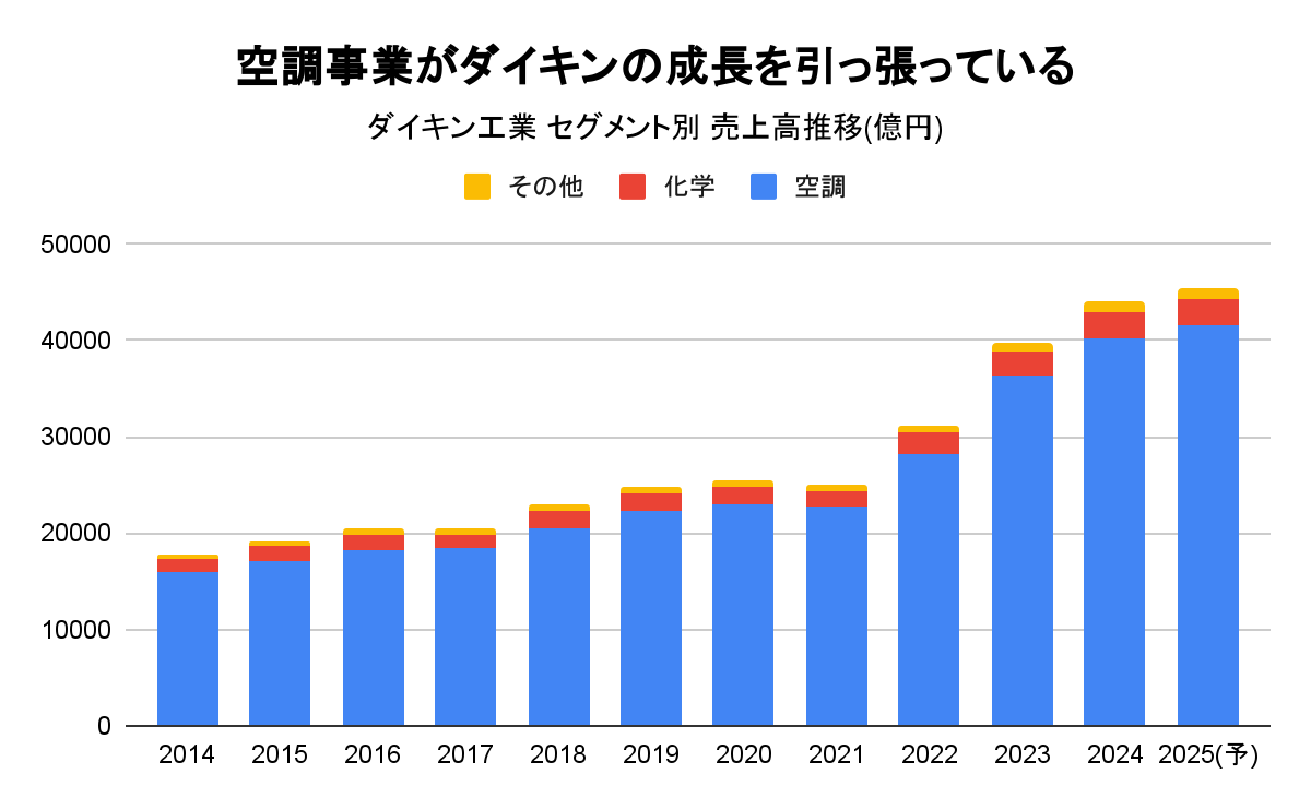 ダイキンは、空調事業と化学事業、その他の3つの事業がありますが、主力はなんといっても空調事業です。売上高の推移を事業ごとに分解すると、空調事業が成長を牽引していることがわかります。