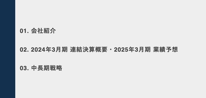 本日は、2024年3月期の通期決算概要、2025年3月期の業績予想、並びに当社の中長期戦略についてご説明します。