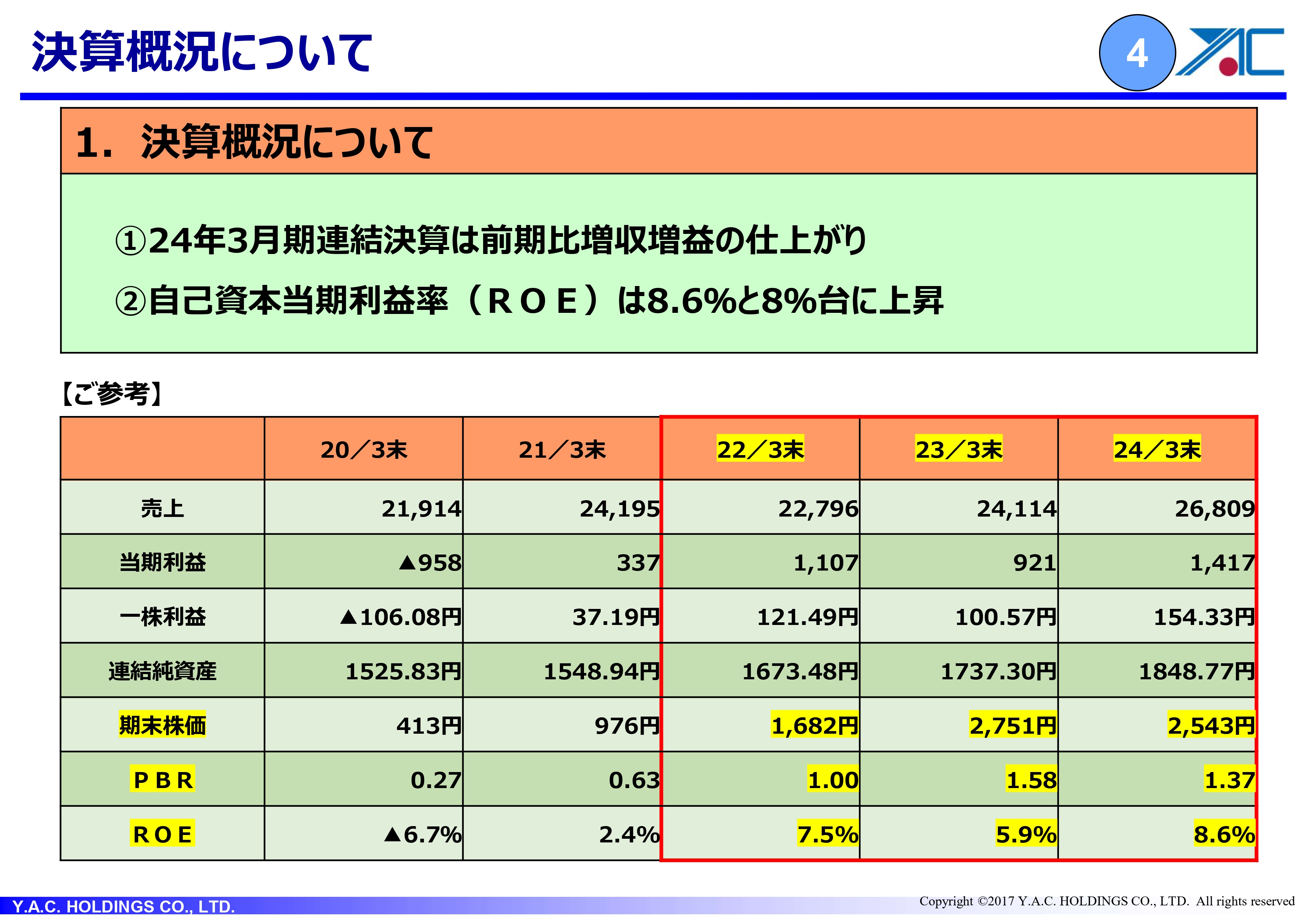 畠山督氏:決算概況です。極めてシンプルに、2024年3月期連結決算は前期比増収増益となりました。自己資本当期利益率(ROE)は8.6パーセントまで上昇し、まずまずの決算だったと理解しています。