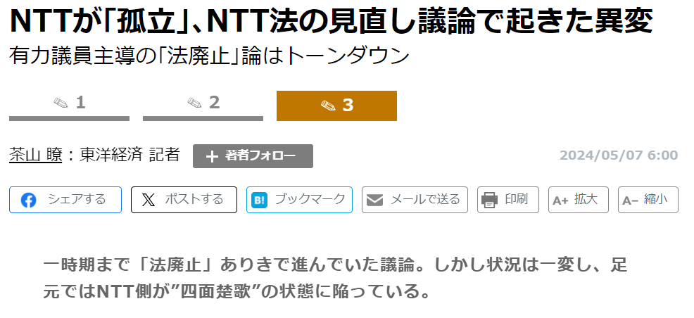 直近の国会までは、NTT法は今後廃止に向けて議論するとなっていたものが、廃止も“含めて”議論するという風にトーンダウンしています。