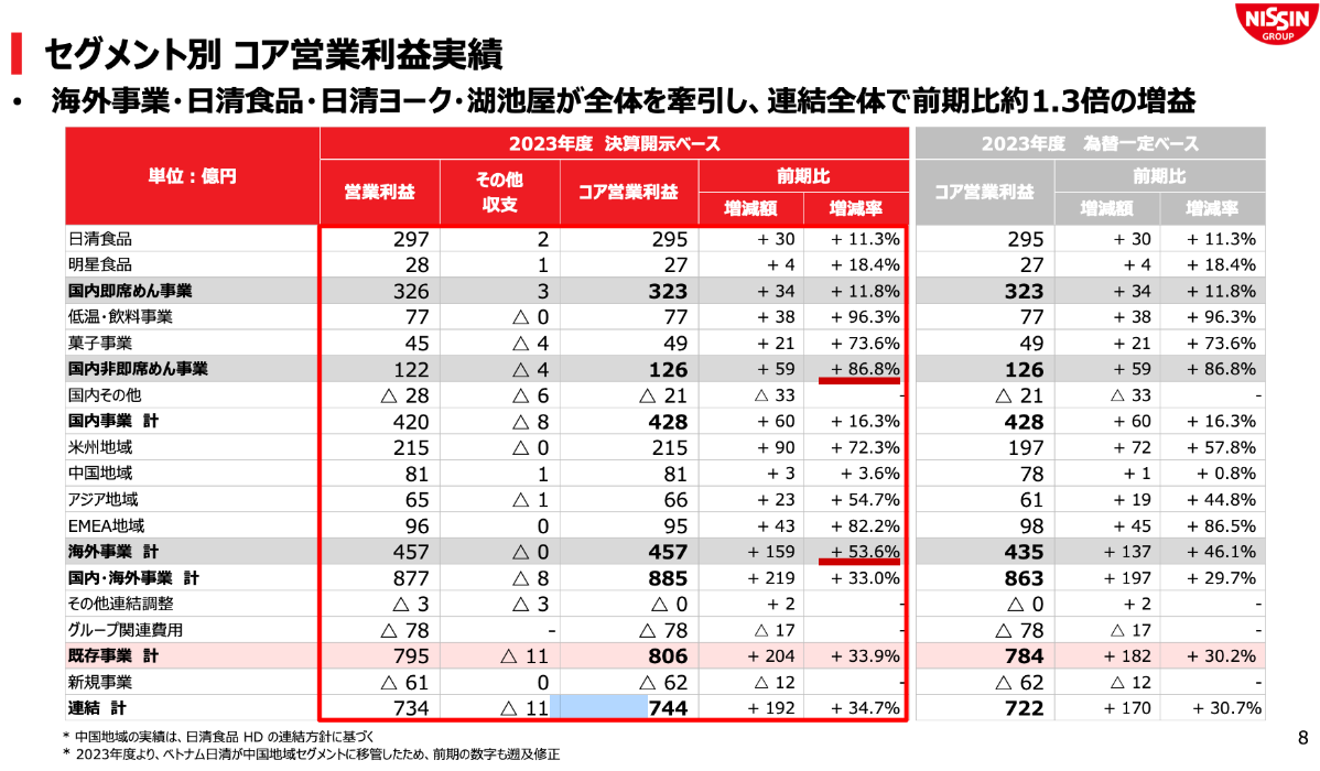 最大の市場は日本ですが、近年の成長源は国内の非即席めん事業、さらに海外事業です。利益推移を見ると、この特徴がより鮮明になります。