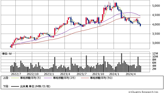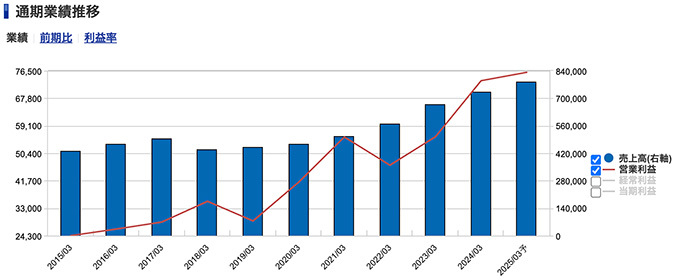 24年3月期の売上高は7,300億円、営業利益733億円で過去最高です。25年3月期の業績予想は7,800億円、営業利益760億円で連続で過去最高を更新する見込みです。