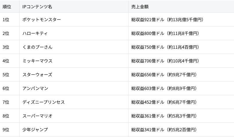 IP(インテレクチュアルプロパティ/知的財産)収益のランキングでは、ハローキティが2位につけています。これは、日本のみならず世界のkawaii文化の象徴となっており、世界中の多くの人に受け入れられている証拠と言えるでしょう。