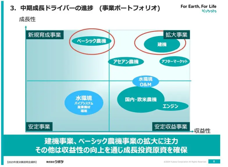 この図を見ると、ベーシック農業と建設機械(建機)成長性が高く、今後注力していく領域であると読み取れます。ここまで説明した国内外(主にアメリカ)の農業機械や水・環境事業は安定しているものの、大きな成長を見込んでいないようです。ここで稼いだキャッシュを、成長事業に投資する流れです。
